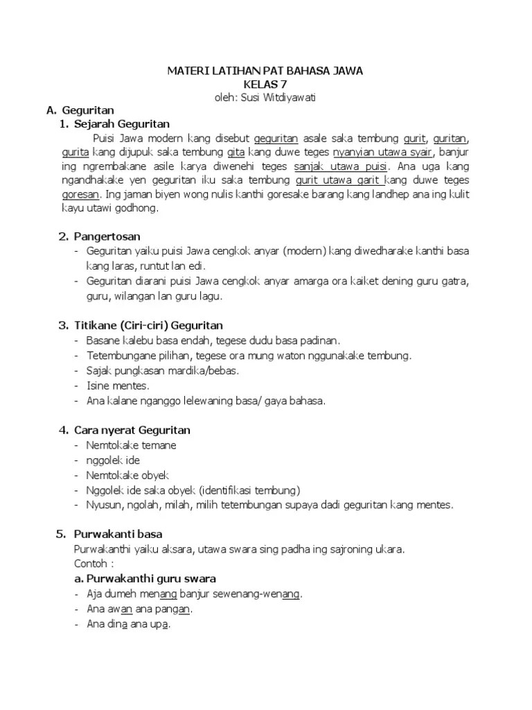Bebas jumlah larike saben pada lan uga bebas jumlah pada/bait. Geguritan atau dalam hal ini puisi jawa modern mulai muncul pada tahun 1929 di majalah kajawen dengan terbitnya tiga buah judul geguritan. Prosa salah sawijining seratan ingkang basanipun gumathok kaliyan teges. Iketaning basa ingkang memper syair (syair jawa gagrag anyar)paugeran (aturan) nggawe geguritan:1 . Pada soal ujian bahasa jawa, pasti anda pernah mendapatkan pertanyaan "jlentrehna kang sinebut puisi gagrag lawas lan gagrag anyar, banjur .