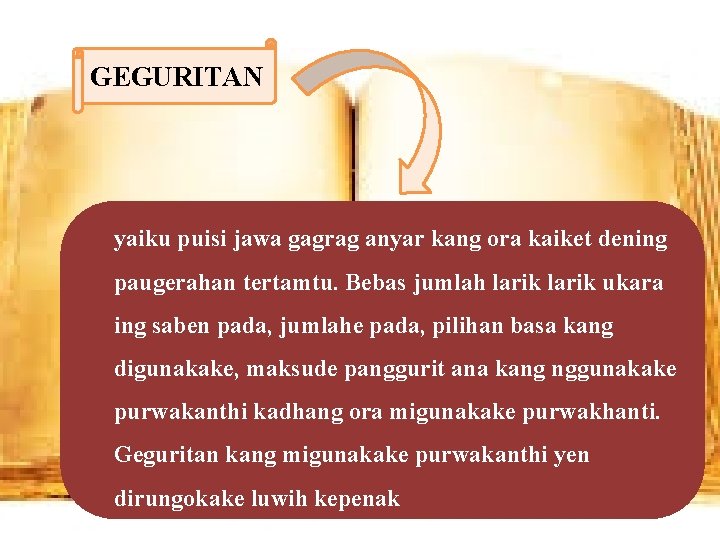 Geguritan diarani puisi bebas amarga ora kaiket paugeran.