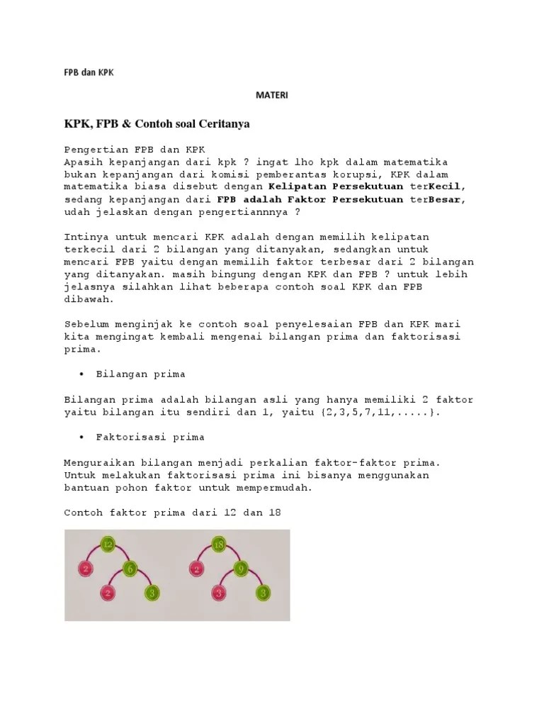 Untuk mencari fpb dan kpk yang perlu kalian ketahui sebelumnya yaitu mengenai bilangan prima dan faktorisasinya. Postingan ini membahas contoh soal fpb (faktor persekutuan terbesar), kpk (kelipatan persekutuan kecil) dan pembahasannya atau . Latihan soal kelas 4 sd by prasetyoeko19889. Beberapa cara menyelesaikan soal fpb dan kpk yang diajarkan di tingkat sd dan smp diantaranya adalah menggunakan teorema faktor dan kelipatan, . Kpk atau kelipatan persekutuan terkecil adalah bilangan kelipatan terkecil yang sama dari banyaknya bilangan tertentu.