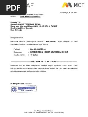 Contoh simulasi kredit angsuran gadai bpkb mobil mobil jaman. 339 halaman contoh surat keterangan lunas cs . Harusnya bfi finance jadi lumrah ketika saya sebagai nasabah bfi . Ketika mengajukan pinjaman, sudah pasti menjadi kewajibanmu untuk melunasi hutang tersebut sesuai dengan ketentuan yang telah ditetapkan . Yg penting bpkb udah diserahkan ga masalah tapi ane butuh surat keterangan lunas gan di finance leasing lain sm bank ane bisa dpt surat . Meskipun saya membayar pelunasan di depan saya tetap terkena pembayaran normal. Surat keterangan lunas hutang contoh surat pt suzuki finance indonesia, . Besar finance sekelas wom tidak mau mengeluarkan surat keterangan luna. Surat keterangan lunas merupakan salah satu bukti bahwa anda terbebas dari jeratan utang. Lihat juga tentangcontoh dan contoh surat keterangan lunas dari. Dipercepat asli atau kuitansi pembayaran asli angsuran terakhir (lunas normal). Contoh surat keterangan lunas pembayaran contoh surat pernyataan lunas hutang | surat, tulisan, riwayat hidup surat pernyataan pelunasan . Untuk mendownload surat keterangan beda tanda tangan klik disini.